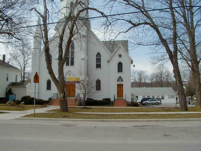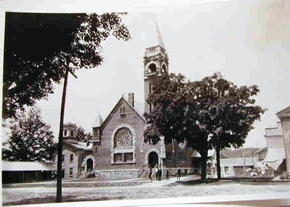 The Baptist Church is a fine example of American Romanesque. It is opposite the United Church on South Main Street and is immediately north of the cobblestone, Masonic Temple. Recognized for its many, rolled cathedral glass windows, it is the congregation’s third.