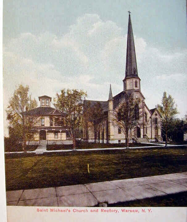 St. Michael’s Church at the Corner of North Main and North Streets was established in 1858. The current church was built between 1887-1888. The arrival of numerous Irish laborers during the construction of the Erie Railroad spurred the creation of a Catholic station, mission and finally a parish in Warsaw. The early brick church used by St. Michael’s still stands today, down the street from the larger church built during the “salt boom” years. In 1903, Father John Rogers purchased a Bavarian Oberammegau apse window that was displayed with church art at the Buffalo Pan-American Exposition in 1901. The window depicts “St. Michael the Archangel.” The present building is an example of American Gothic architecture made out of wood.